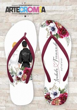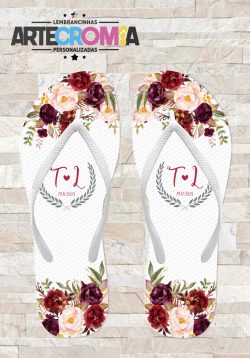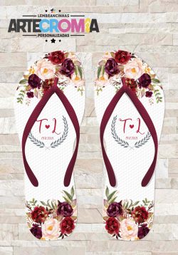 Chinelo personalizado casamento com noiva e noivo e flores branca e marsala – MDL 206