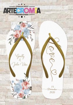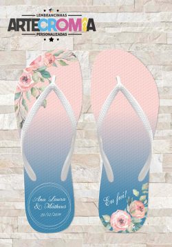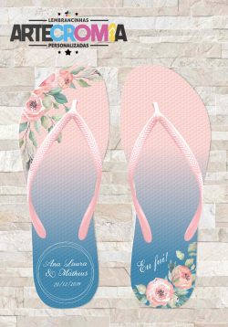 Chinelo personalizado casamento com flores rosa e fundo azul e rosa – MDL 195