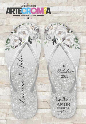 Chinelo de Casamento Flores Brancas e Cinza feito glitter MDL 532