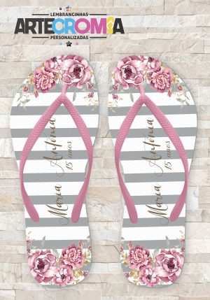 Chinelo Para Festa de Aniversário 15 anos Flores rosa e cinza MDL 043