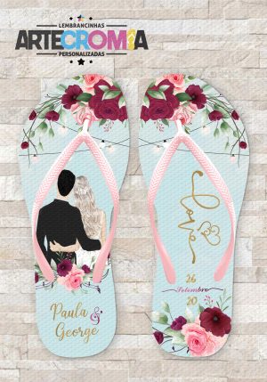 Chinelo personalizado casamento noivo e noiva e flores rosa e marsala – MDL 367